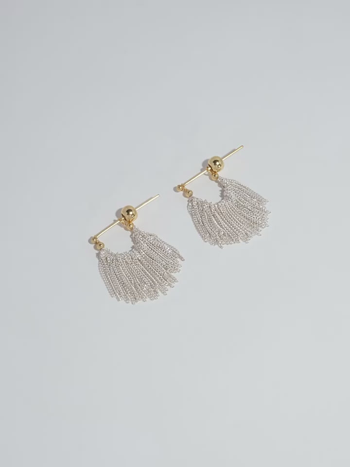 Elegant drop earrings featuring layered silver tassel chains with a geometric bar-and-ball stud design. Crafted with 925 sterling silver and brass details, finished with multiple plating layers for durability and color retention.