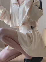 The loose sports top effortlessly pairs with the sweet and cool short skirt, highlighting the classic herringbone waist design. To enhance the visual appeal, two vertical stripes are added to both sides of the waist, creating a slimming effect. The bottom of the top includes an elastic adjustment buckle for a relaxed and casual fit, while the navy blue and beige color combination adds a nostalgic touch.
